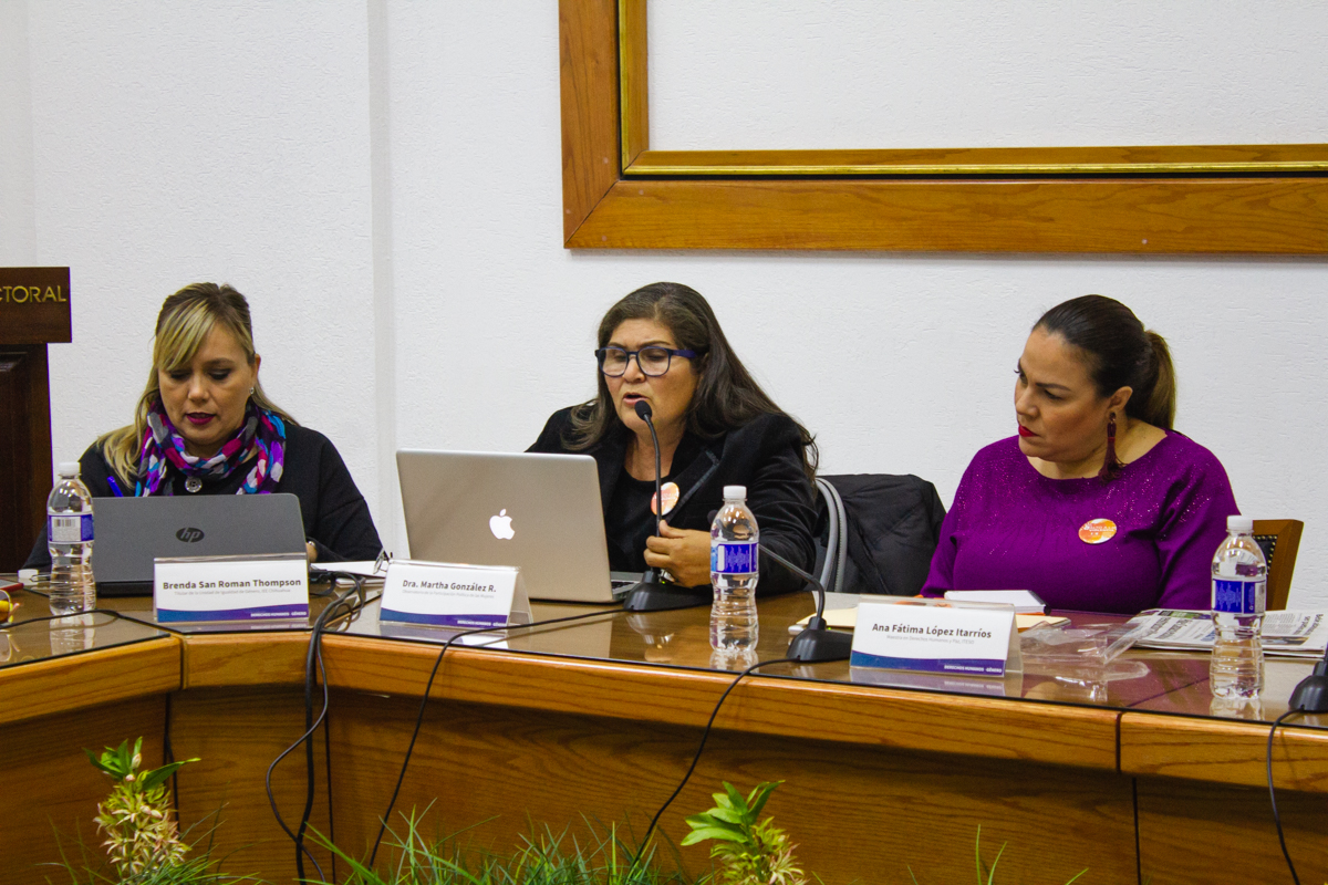 Las ponentes estuvieron acompañadas y fueron presentadas por las consejeras electorales Georgina Ávila Silva y Fryda Licano Ramírez, y consejeros electorales Gilberto Sánchez Esparza y Gerardo Macías Rodríguez; además de la titular del la Unidad de Igualdad de Género del Instituto Estatal Electoral de Chihuahua (IEE), Brenda San Román.