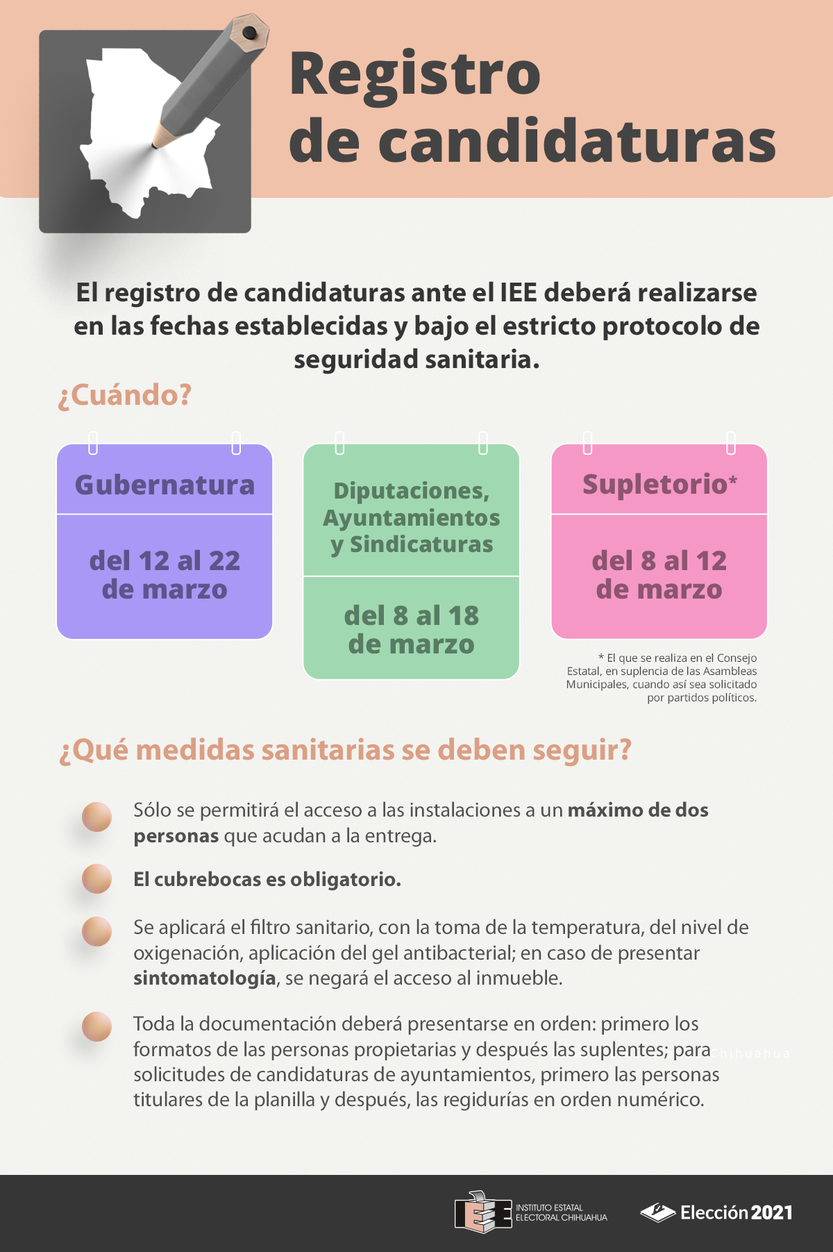 Chihuahua — Este lunes 8 de marzo comenzó el periodo para el registro de candidaturas en el proceso electoral local 2020-2021. En el contexto de la pandemia y ante la obligación de garantizar el derecho a la salud y el ejercicio de las prerrogativas político-electorales de la ciudadanía, la entrega y recepción de la documentación deberá realizarse bajo el estricto protocolo de seguridad sanitaria.