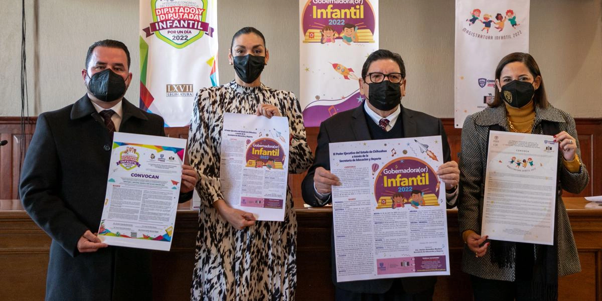 Chihuahua, Chih. — El Instituto Estatal Electoral (IEE), el Tribunal Superior de Justicia del Estado, el Congreso del Estado y la Secretaría de Educación y Deporte de Gobierno del Estado de Chihuahua, presentaron en rueda de prensa, las convocatorias Gobernadora(or) Infantil 2022, Diputado y Diputada Infantil por un día edición 2022 y Magistratura Infantil 2022.
