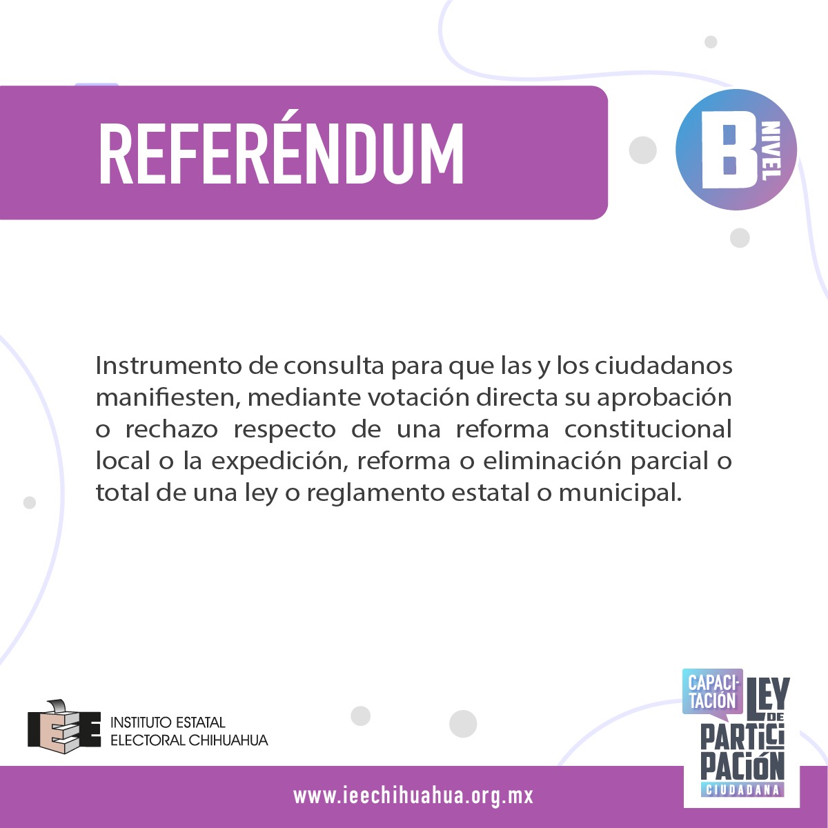 Referéndum es un instrumento de participación política, previsto en la Ley de Participación Ciudadana del Estado de Chihuahua, y que permite a la ciudadanía pronunciarse, mediante votación directa, si apoya o rechaza una reforma constitucional, una ley o reglamento estatal o municipal