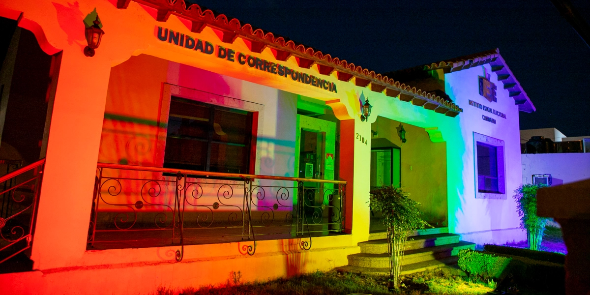 Chihuahua, Chih. — En apoyo a la población de la diversidad sexual y para conmemorar el 28 de junio, Día Internacional del Orgullo LGBTTTIQ+, las instalaciones del Instituto Estatal Electoral de Chihuahua (IEE), se iluminaron con la bandera del arcoíris, esto en el marco del 25 aniversario de la institución.